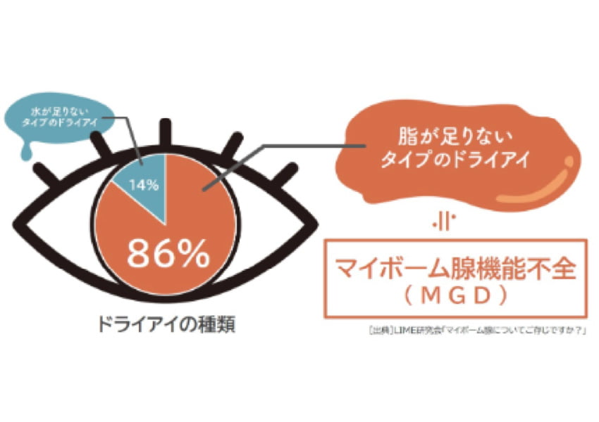 涙の成分のほとんどは水分でできていますが、水分が蒸発しないように涙の表面は薄い油の層でおおわれています。その油は、まぶたの中にあるマイボーム腺というところから分泌されますが、ドライアイ症状を訴える方の80%以上において、MGD(マイボーム腺機能不全)による油分不足が関係していると言われています。