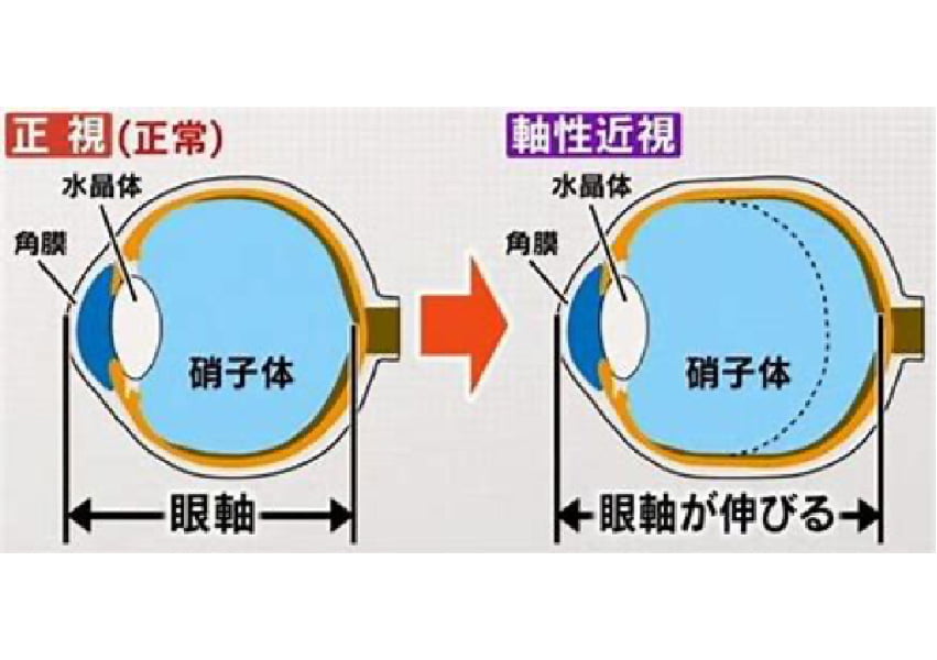 近視とは、外から入ってきた光が網膜の手前で焦点を結ぶ状態のことを指し、近くが見えて遠くが見えない状態です。眼球の長さと、角膜や水晶体の光を集める力のバランスが悪くなるために引き起こしてしまいます。一般的に近視が進むということは眼軸長が伸びることによって、ピントが合わなくなることをいいます。
