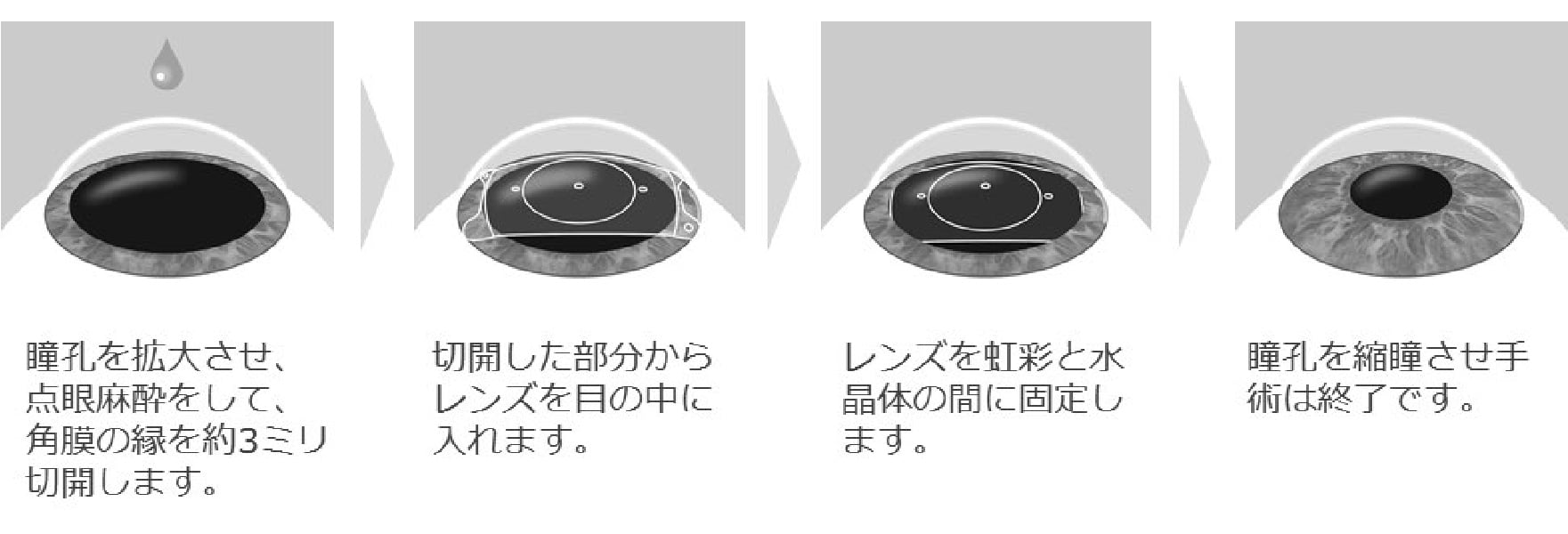 ICLの手術方法:手術は局所麻酔(通常は点眼麻酔のみ)で行い、痛みはほとんどありません。角膜の周辺部を約3mm切開し、ICLを折りたたんだ状態で眼内に挿入します。ICLを後房(虹彩と水晶体の間隙)に固定し、眼内を洗浄して終了します。必要に応じ、創口を縫合することがあります。片眼あたり5-10分程度の手術です。片眼の手術が終了し問題ないことを確認の上、もう片眼の手術を行います。
